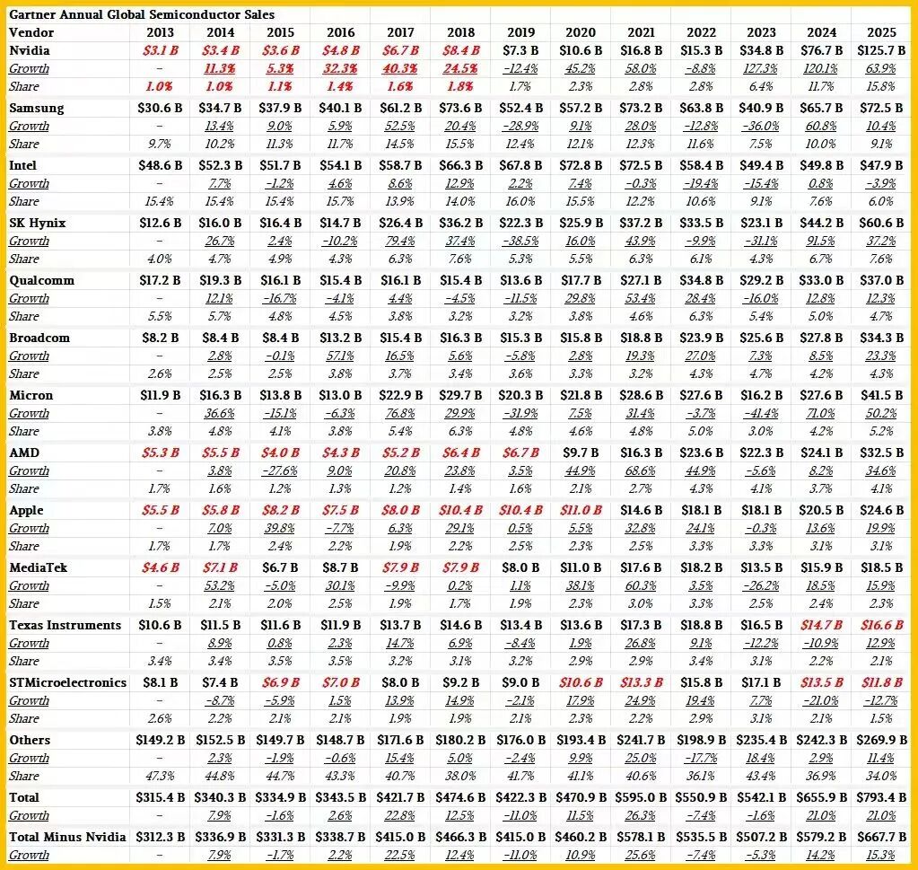 让我们仔细分析这些数据,并研究如何利用过去十三年各芯片厂商的收入数据来构建模型。我们采用了Gartner 提供的前十大厂商数据,并尽力估算了意法半导体和德州仪器的表现。然而,英伟达的迅猛崛起以及苹果(该公司为其销售的设备设计和制造了大量芯片)和联发科的增长,使这两家公司跌出了排名。