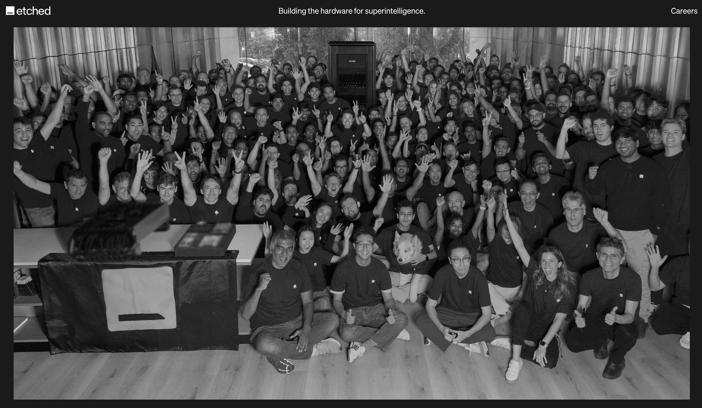 目前Etched官网还未披露自研AI芯片相关信息,仅在主页晒出一张团队大合影,并写下“构建超级智能硬件”的目标。